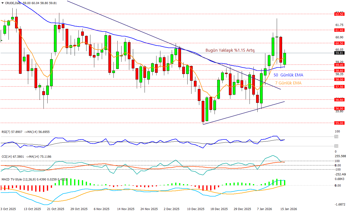 Crude günlük grafikte son haftalarda sıkışan yapının yukarı yönlü kırıldığını ve düşen trend çizgisinin üzerine atarak momentumu toparladığını görüyoruz nitekim fiyat bugün yaklaşık %1,15 artışla 59,83 civarında tutunurken, 7 günlük EMA’nın hızla yukarı dönmesi kısa vadeli alıcı iştahını destekliyor. Bununla birlikte son iki gündeki sert yukarı iğneler ve ardından gelen geri çekilme, 60,50–61,40 bandının güçlü bir dirençbölgesi olduğunu ve bu bandın aşılmadan trendin yüklelişe dönmesinin zor olabileceğini söyleek mümkün. Aşağıda 59,00 ve 50 Günlük Ema çevresi ilk destek alanı olarak öne çıkıyor. Gösterge tarafında RSI’ın 50 üstünde kalması ve MACD’nin pozitif bölgede olması pozitif, fakat ivme tarafındaki dalgalanma nedeniyle fiyatın bir süre 59–61,40 aralığında sindirme yapması şaşırtıcı olmaz.
