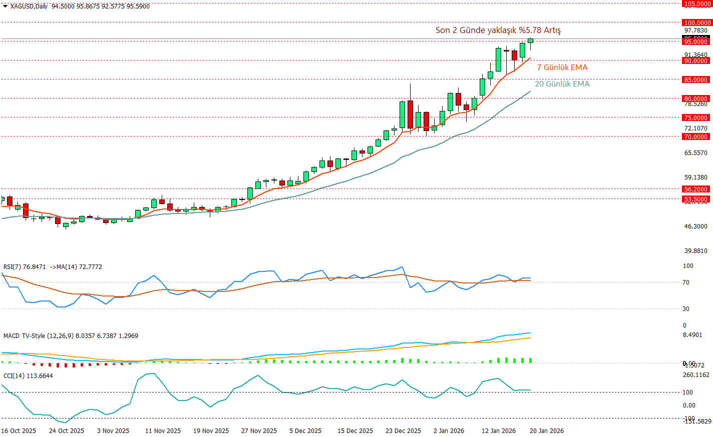 Ons Gümüş günlük grafikte fiyat 20 günlük EMA’nın üzerinde hızlanmış, 7 günlük EMA da 20’liğin üzerinde kalarak kısa vadeli momentumu teyit ediyor ve son iki gündeki yaklaşık %5,8’lik sıçrama sonrası 95 bölgesine kadar çıkarak rekor üstüne rekor kırmaya devam ediyor. RSI 76 ile aşırı alım bölgesinde ama böyle güçlü trendlerde aşırı alım satım bölgelerinde olması net bir dönüş sinyali olarak okunmamalı, CCI’ın +100 üzerinde kalması uzun pozisyonlar için pozitif ve MACD’nin artan eğimi yükselişin güçlü olduğunu söylüyor.. Bu tabloda 95 bandı ilk direnç olarak izleniyor ve fiyat şuanda bu seviyeyi test ediyor. Aşağıda olası düzeltmelerde 90 bölgesi ilk kritik destek, buranın altına sarkma 85–80 bandına doğru daha derin bir nefeslenme alanı açabilir. Ancak şuan ki durum ivmenin güçlü olduğu göstergelerinde bu durumu desteklediği bir resim çiziyor.