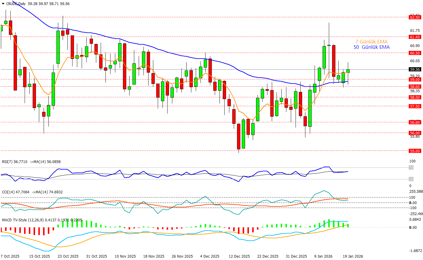Crude oil günlük grafikte yeni yılın ikinci haftasından sonra atağa geçmiş durumda ve şuan 59.65 civarında işlem görmekte ve şu an yeniden 7 günlük EMA’nın üzerinde tutunması kısa vadede alıcıların devrede kaldığını, 50 günlük EMA’nın da aşağıdan yükselmeye başlaması ise orta vadede pozitif işaret olarak okunabilir. RSI 57 seviyesinde nötr-pozitif bölgede kalırken, CCI’ın zirveden gerilemesi ile 50 seviyelerine geri çekilmesi ve MACD pozitif bölgede olsa da histogramın zayıflaması yükselişin şimdilik konsolidasyon yaptığı mesajını veriyor. Bu tabloda 59,00–58,60 bandı ana destek; bu bölgenin altına sarkma 57,50 ve 56,60-56,00’a doğru alan açabilir. Yukarıda ise 60,50 ilk eşik, ardından 61,40 ve 62,50 yeniden test edilmesi gereken ana dirençler;, 60,50 üzeri kapanışlar momentumun tekrar güçlendiğine işaret eder.