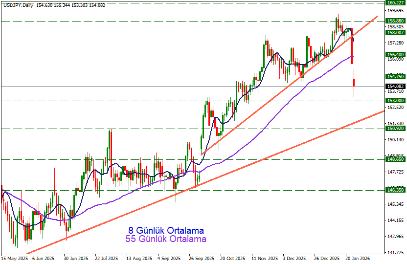 Yen lehine tepkilerin devamında önce 153.00 bölgesi ardından grafikteki aşağı kısımda bulunan yükseliş trend çizgisi destek olarak test edilebilir.