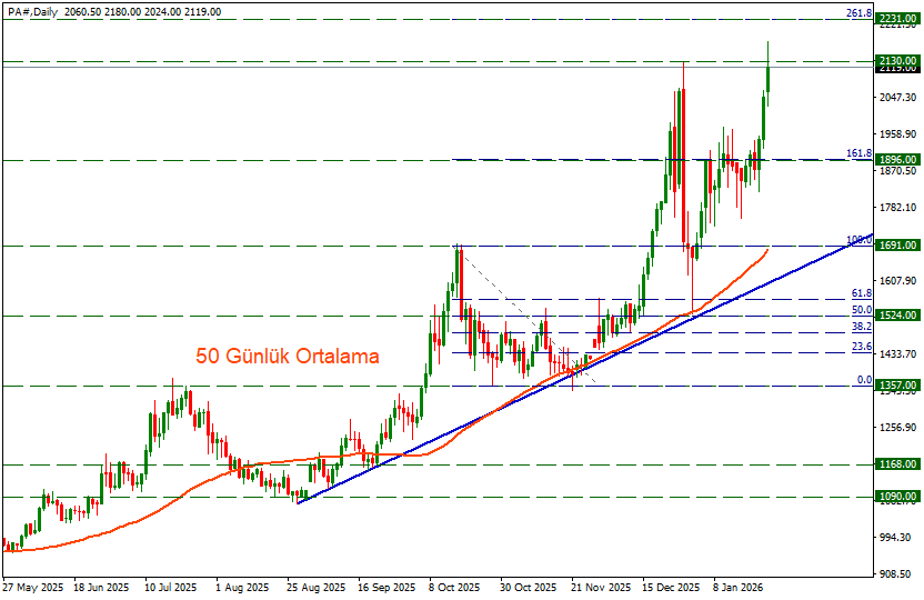 Geçtiğimiz haftayı pozitif geçiren ve 2047 seviyesinde kapanış yapan paladyum, yeni haftaya da pozitif başladı. Gün içindeki yükselişler 2130 direncini aşarak 2180 seviyesine kadar ulaştı. Bu seviye en son 2022 Ekim’de test edilmişti.