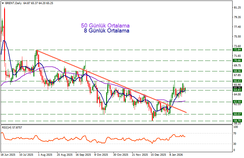 Brent petrol geçtiğimiz haftalardaki güçlü yükseliş ivmesinde 66.63 direncini aşamadı. Bu dirençten alınan düzeltmenin ardından yükseliş ivmesi adım adım 66.63 direncine doğru yaklaştı. Yeni hafta brent petrol için yatay ve sakin ilerlerken bugün 8 günlük hareketli ortalamanın da kesiştiği 64.83 bölgesi alıcılar için destek oluşturuyor.