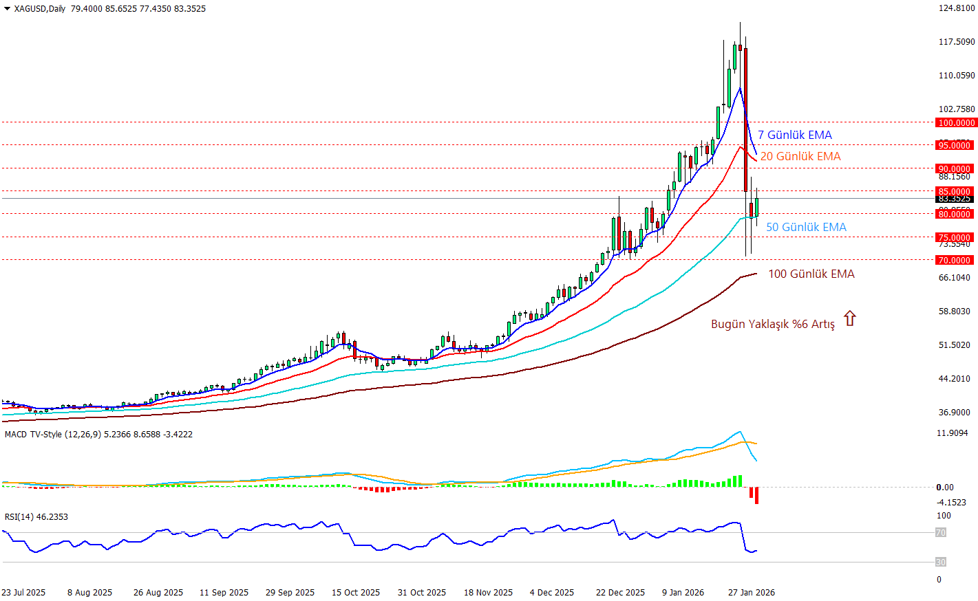 Ons Gümüş yeni güne toparlanma ile giriş yaptı ve 85 dolar seviyesini test etmeye başladı. Şuana kadar yaklaşık %6 değer kazanan ons gümüş 85 dolar seviyesini geri kazanabilirse 7 ve 2 günlük EMA’lar ile 90 dolar seviyesine doğru ivmelenebilir. RSI grafiğinde hafif bir toparlanma sinyali var ancak MACD tarafında henüz bir pozitiflik mevcut değil ama momentum kuvvetli bir şekilde devam ediyor. Bu durumda dalgalanmaların boyutları bakımından dikkat edilemesi gerekn bir nokta olarak karşımızda duruyor. Kısa vadede 50 günlük EMA ve 80 dolar seviyesi iç içe geçmiş durumda ve kritik güçlü bir destek noktası olarak fiyatı desteklemekte ve bunu sürdürürse gün içinde yükselişin korunabileceğini söyleyebiliriz. Aksi taktirde tekrar 75-70 dolar seviyelerine iğneler görebiliriz.