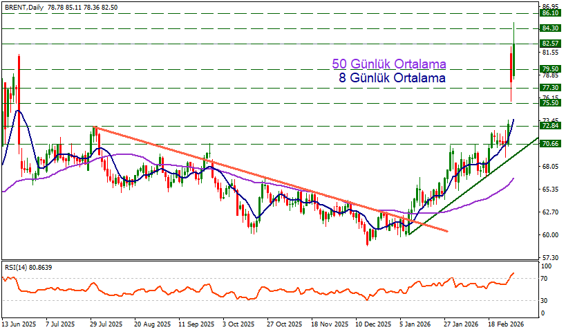 Brent petrol, jeopolitik gerilimler ve Hürmüz Boğazı’nın geçişlere kapatılması sebebiyle yükselişine devam ediyor. Güne 78.78 seviyesinde giriş yapan brent petrol, gün içinde en son 2024’ün Temmuz ayında görülen 85.11 seviyesini test etti. Ardından gelen geri çekilmelerle anlık fiyatlamalar 82.57 bölgesindeki direnci test ediyor.